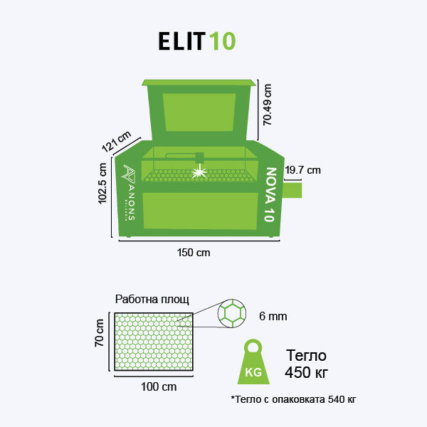 Теглото и на двата модела е 450кг. Лазерите Nova Super 10/ Nova Elit 10 позволяват доставка с камион с падащ борд, в случай че не разполагате с подемна техника. Веднъж свален на равна и гладка повърхност, лазерът може да се транспортира и с палетна количка или с колелцата на машината при положение, че работното помещение е на партерен етаж. Ако помещението е на по-висок етаж или на ниво -1 ще Вие необходим кран, мотокар или челен повдигач. Машината позволява да се разглоби на две части при необходимост да влезне през стандартна врата 90см.В зависимост от особеностите на помещението е възможно да се наложи да се среже дограмата или стената, през която е най-удобно позиционирането на машината.