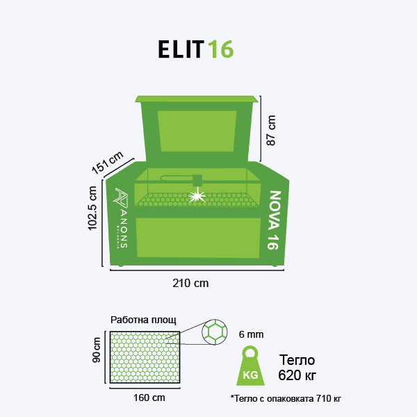 Теглото и на двата модела е 620 кг. Лазерите Nova Super 16/ Nova Elit 16 НЕ могат да бъдат доставени с камион с падащ борд. Веднъж свален на равна и гладка повърхност, лазерът може да се транспортира и с палетна количка при положение, че работното помещение е на партерен етаж. Ако помещението е на по-висок етаж или на ниво -1 ще Ви е необходим кран, мотокар или челен повдигач. Машината позволява да се разглоби на две части при необходимост да влезне през стандартна врата 90см. В зависимост от особеностите на помещението е възможно да се наложи да се среже дограмата или стената, през която е най-удобно позиционирането на машината.