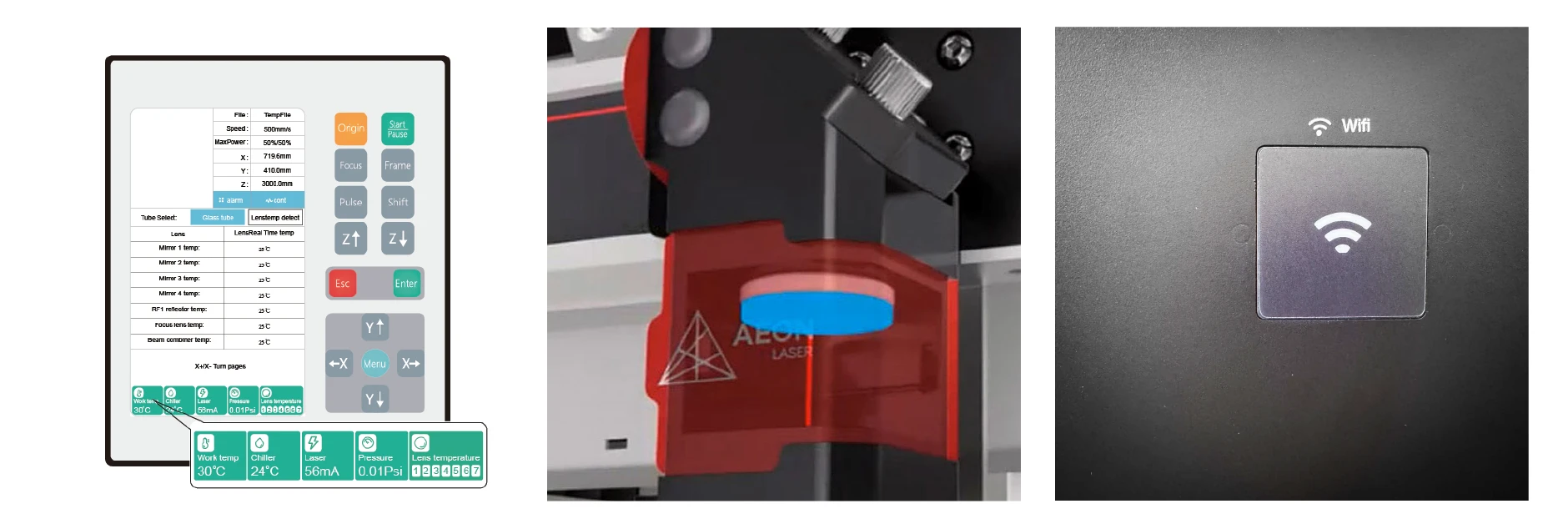Aeon е известен със своя стилен и елегантен външен вид. Логото на Aeon Laser на панела на предния капак вече е осветено и е с двойна функция и като лампа за състоянието, светейки бяло, когато е в режим на готовност, червено, когато възникне грешка, и зелено, докато машината работи, добавяйки както стил, така и функция към вече зашеметяващия дизайн.
