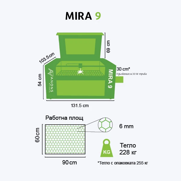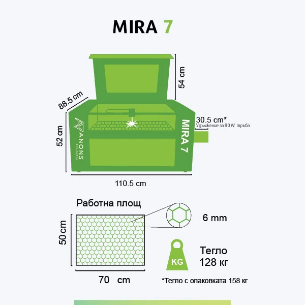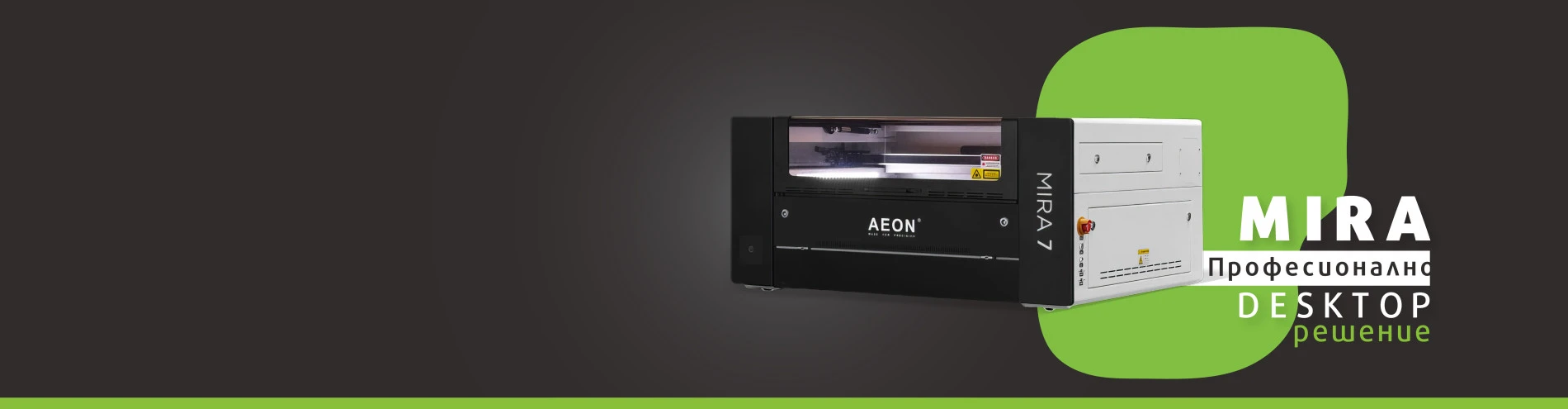 Новият лазер Mira е разработен на базата на над 18 години опит при поддръжката на СО2 лазери и отзиви от клиенти. Резултатът е голяма производителност, качествено гравиране и рязане, достъпна цена, функционалност и добър дизайн. Целта e машината да бъде сравнително компактна, така че да може да се инсталира почти навсякъде, без да се компрометира здравината и качеството на машината, като се напълни с пластмасови компоненти. Металното тяло е достатъчно здраво, за да издържи на сериозна и непрекъсната употреба, но достатъчно леко, за да бъде транспортирано лесно от едно място на друго. Предлага се с 60W или 80W стъклена СО2 лазерна тръба или с 30 или 60W метална RF СО2 тръба. Работи с 5G ускорение..