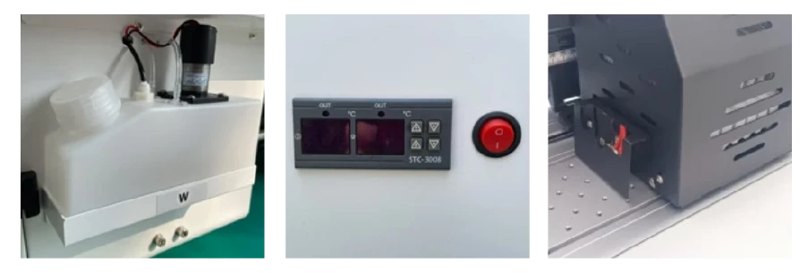 Система за автоматично и равномерно посипване на DTF пудрата върху отпечатаното фолио, елиминираща нуждата от ръчно нанасяне.
