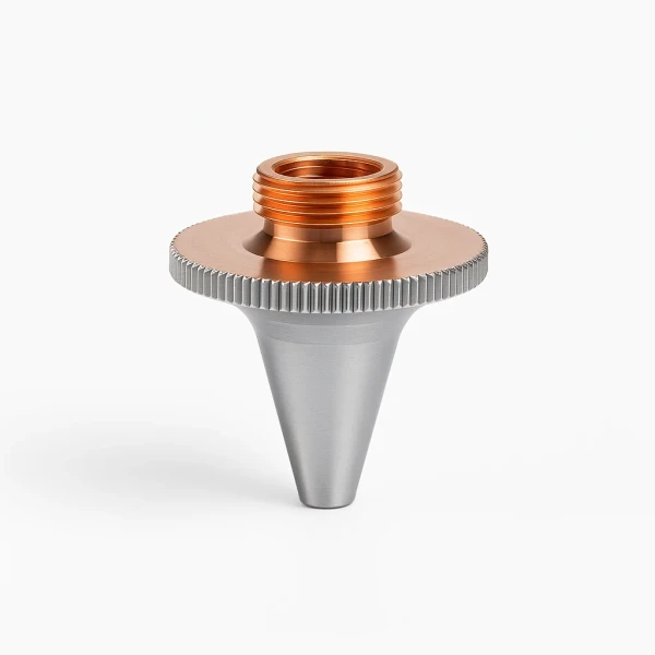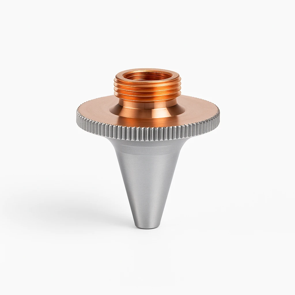 Двойната дюза е оптимизирана за рязане на черни метали и стомана с Fiber лазер. Работи с кислород като газ за рязане, което позволява по-висока скорост, стабилност и ефективност при обработката на въглеродна стомана и конструкционни метали. Благодарение на двойната си структура, осигурява по-добър контрол на газовия поток и прецизно рязане с минимални дефекти.