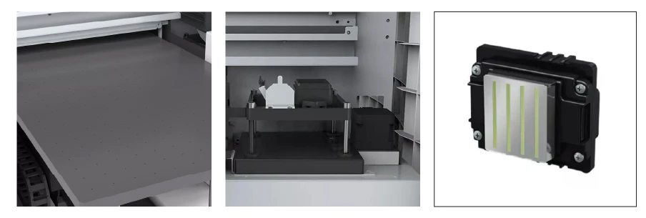 Снабден с 8-канална индустриална печатаща глава Epson I3200, позволяваща печат с висока резолюция и фото качество, цветната система за печат е - CMYK + Бяло + Лак. Машината се доставя с лицензиран RIP софтуер Future RIP. Печата едновременно бяло, цвят и лак. Лакът ви позволява да добавите допълнителна реалистичност на дизайна. Възможност за печат на растерен бял цвят и на 3D релефен печат.
