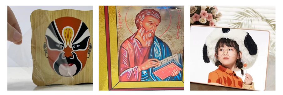 Използвайте UV принтер, за да отпечатате върху изображенис върху UV DTF филм. Ламинирайте с тънък ролков ламинат на висока температура и вече имате готов прозрачен стикер. Залепянето на фотовия стикер не е ограничено от материал или форма на продукта и може да бъде залепен върху различни материали, като дърво, керамика, стъкло, плат, метал, пластмаса и др. Приложението му е неограничено.