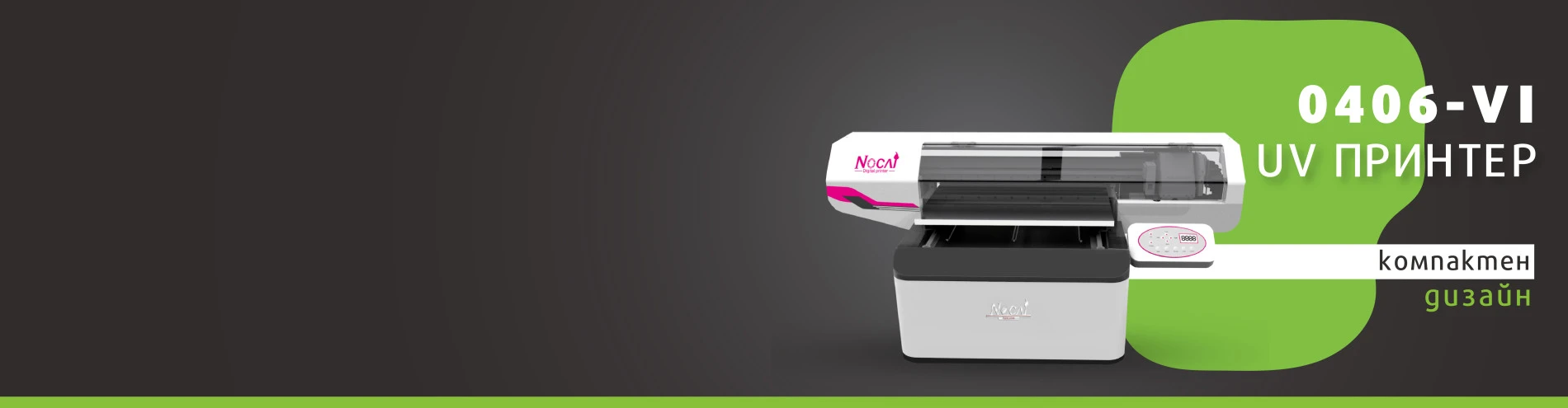 NC-UV0406 е първият UV мастиленоструен принтер с независима платка и формат за печат 60*40 см. Малкият дигитален мастиленоструен UV принтер Nocai е преработен до шесто поколение. Характеризира се със стабилност, компактност, спестяване на място и разнообразни сфери на приложение. Той е много подходящ за персонализиране на рекламни сувенири, кейсове за мобилни телефони, магазини за сувенири, фото студиа и други.
