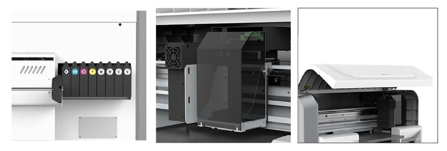 Интелигентна система за пълнене на мастило с непрекъснато подаване за предотвратяване на изтичане на мастило и неправилно пълнене. В същото време принтерът има функции за автоматична циркулация на мастилото и аларма за недостиг на мастило, за да предотврати утаяване на мастило и да сигнализира за ниско ниво на мастило в резервоарите.