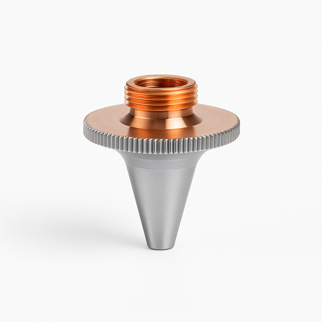 Единична дюза за Fiber лазер – рязане с азот Единичната дюза е специално проектирана за рязане на цветни метали с Fiber лазер – алуминий, неръждаема стомана, мед и месинг. Работи с азот като газ за рязане, което гарантира чист разрез без окисляване и високо качество на крайния детайл. Подходяща е за прецизни и бързи операции, при които се изисква гладка повърхност и минимална обработка след рязане.